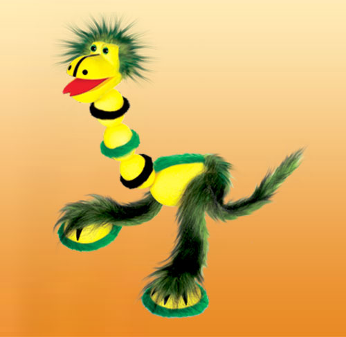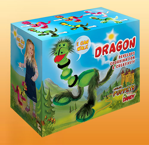 Draci v rôznych farbách. Táto bábka je ľahko ovládatelná aj pre deti od 3 rokov. Má len 4 povrázky a rozoberateľné vodítko. Je 33 cm vysoká.